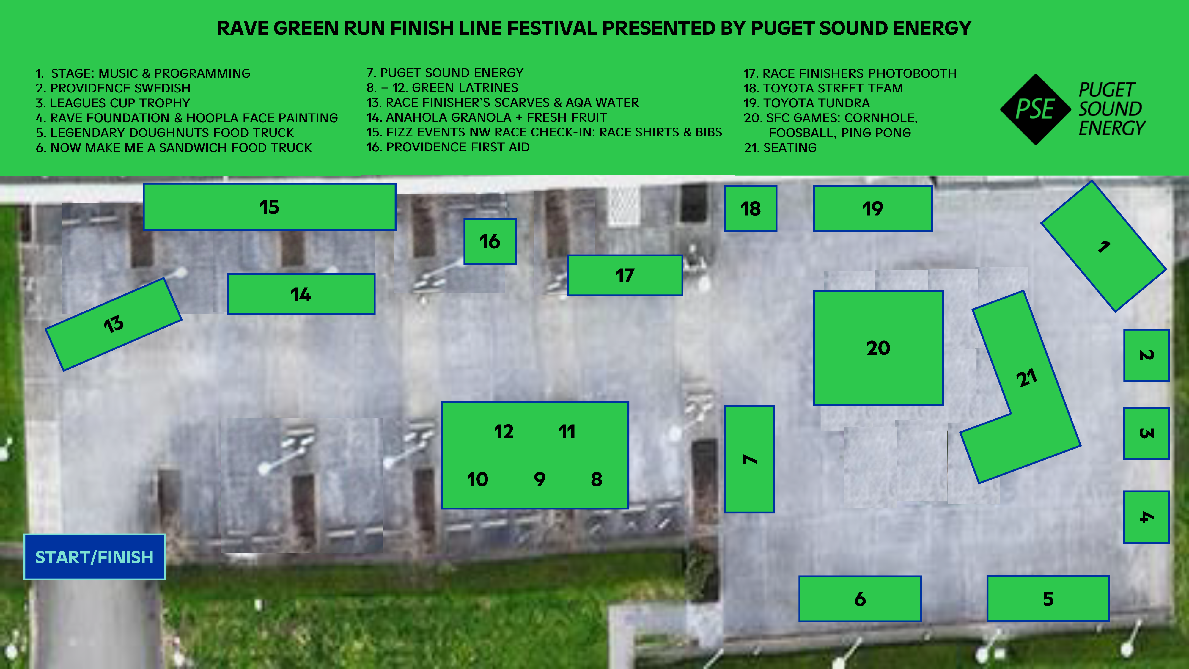 After crossing the finish line, runners and spectators are invited to the Rave Green Run Finish Line Festival presented by Puget Sound Energy for post-race activities thanks to Puget Sound Energy, refreshments, vendor booths, and plenty of food, drink, music, and fun! Have a great time celebrating your Seattle Sounders FC, and the Rave Green in all of us!